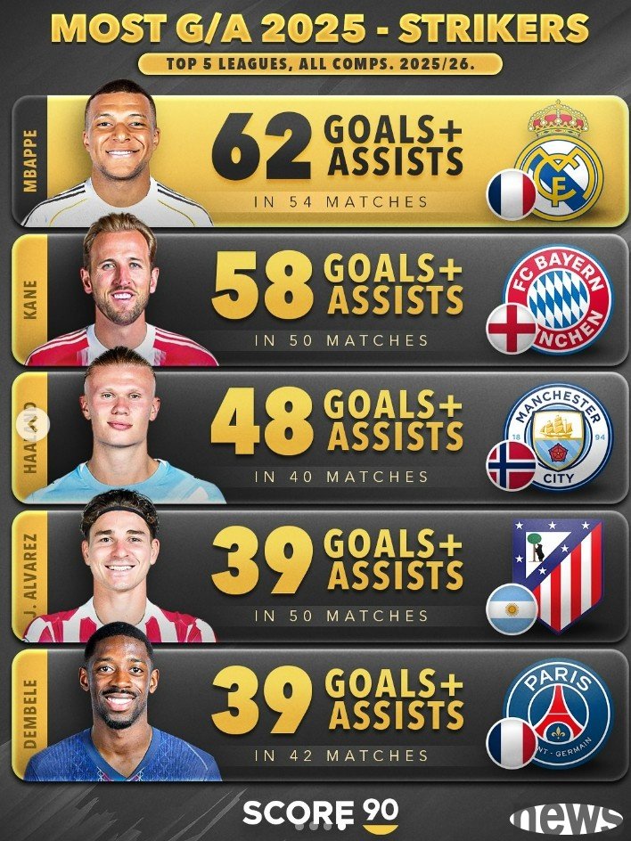 The data website Score90 took stock of the forward players in the five major leagues in 2025 and participated in the goal scoring list in various events (club + national team). Among them, Mbappe topped the list with 62 goals. The following is the specific situation (goals + assists):