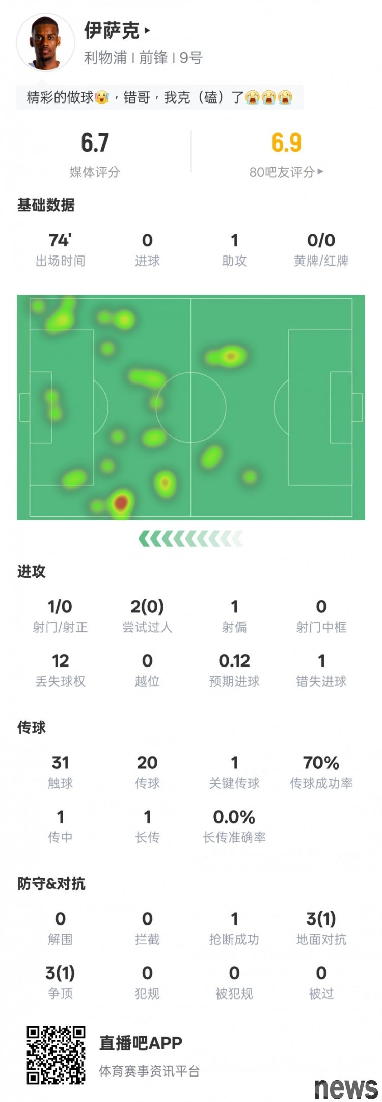 A focus game in the 7th round of the Premier League in the 2025-26 season, Liverpool played away against Chelsea. Isaac started, giving away 1 assist, 1 key pass, missing 1 goal opportunity, and rating 6.7.