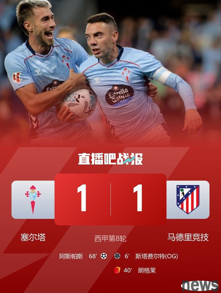 Atletico Madrid draw Celta 1-1 in this round, Aspas scored a goal, Longlei drew red in the 40th minute, causing Atletico Madrid to fall into a passive position.