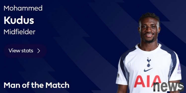 Tottenham player Kudus performed well in this game, scoring one goal and assisting once, completing 6 passes. After the game, he was also elected as the official Premier League fan to vote for the best player in the game.