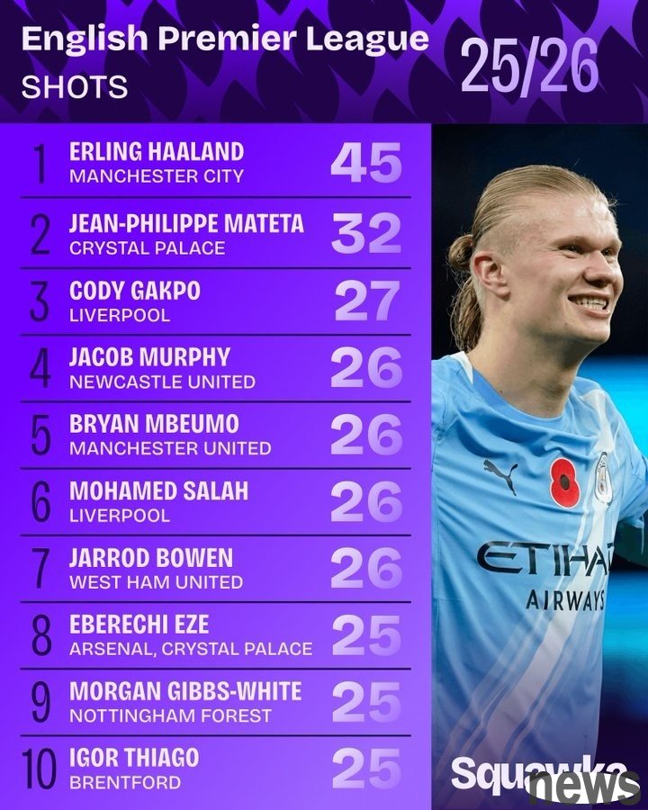 The Premier League has gone on for 11 rounds. Squakwa also counted the number of shots in the Premier League this season, and Haaland leads the way.
