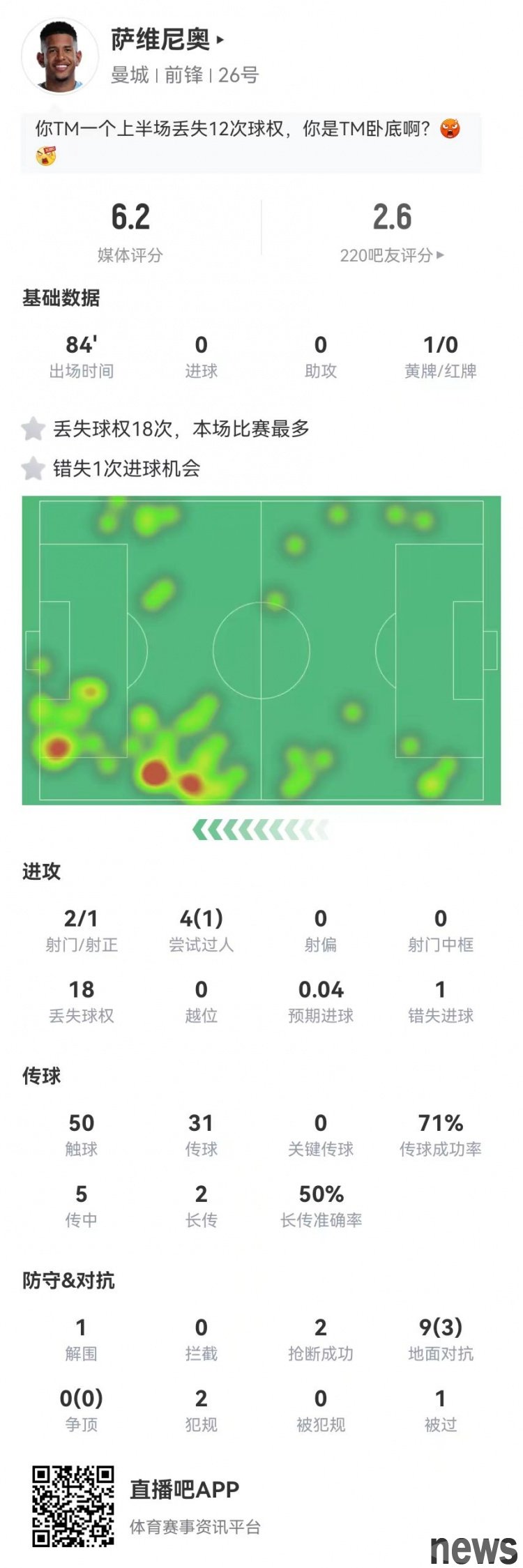 Man City lost to Villa 0-1 in this round of the Premier League. Savinho's statistics for this game are as follows: