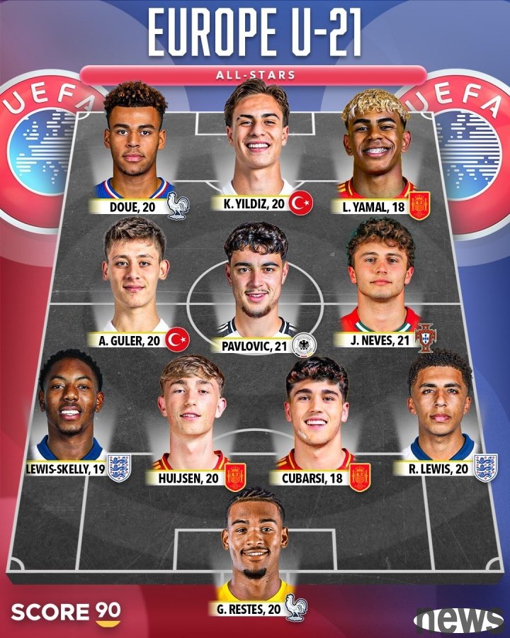Score 90 selected the European U21 all-star lineup, led by Yamal and Joao Neves, including three from Spain, two each from Turkey, France, and England, and one each from Portugal and Germany.