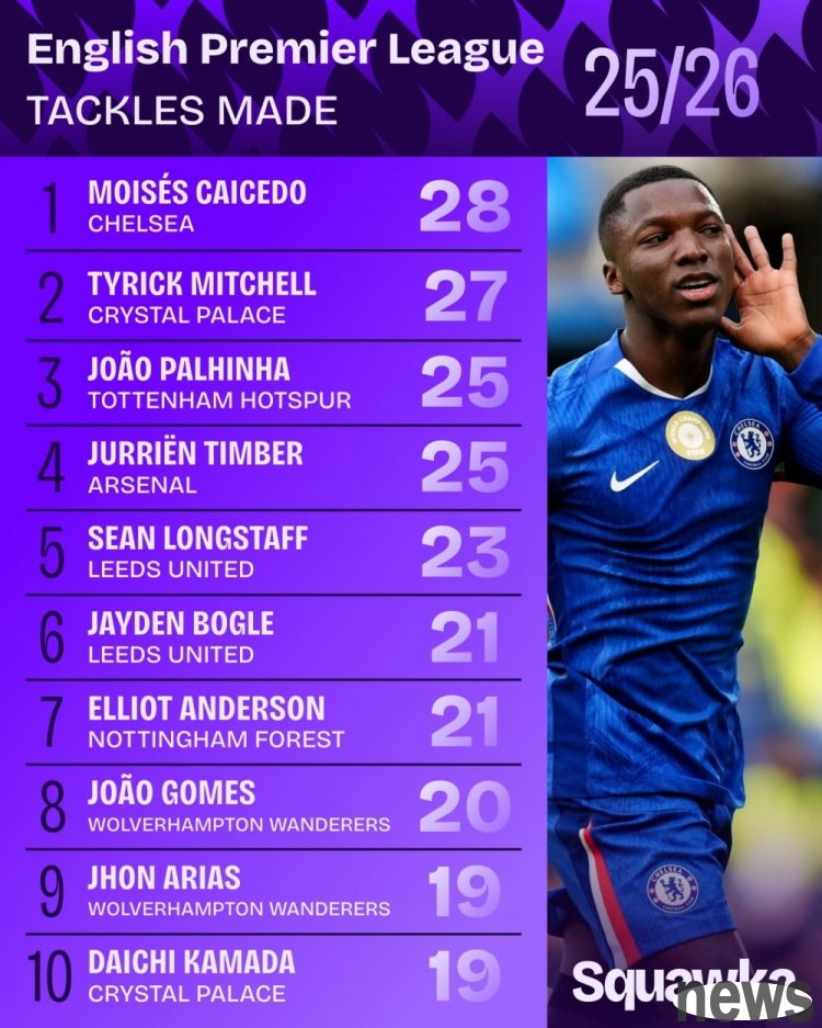 Squawka counted the top ten Premier League steals this season, Chelsea midfielder Kessedo ranked first 28 times, and Arsenal defender Timber ranked fourth 25 times.
